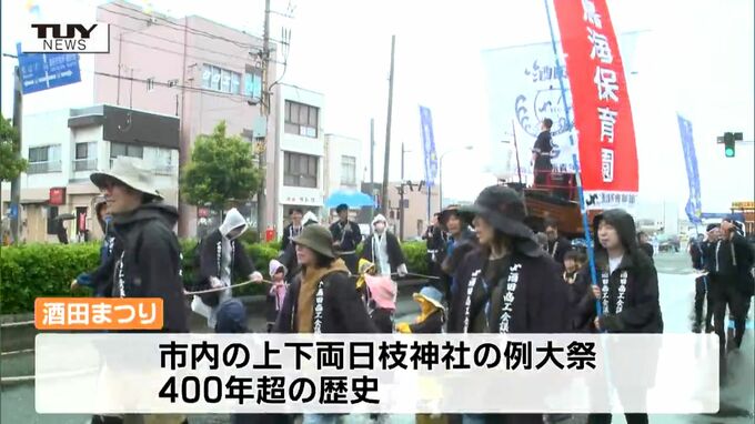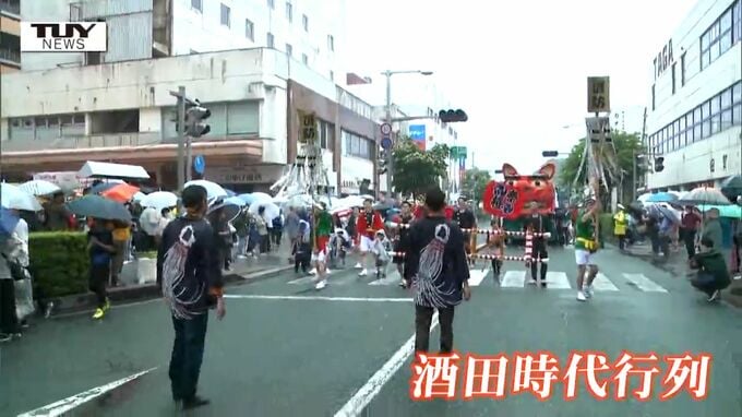 山車行列の後は、酒田の歴史をテーマにした山車が市内を練り歩く酒田時代行列が行われるなど、雨の中でも会場では観客たちの熱気があふれていました。