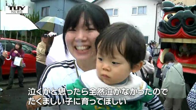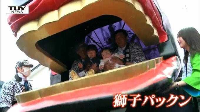 こちらは子どもを獅子の口の中に入れて噛むフリをする「獅子パックン」。獅子に噛まれた子は健康になるという言い伝えがあります。