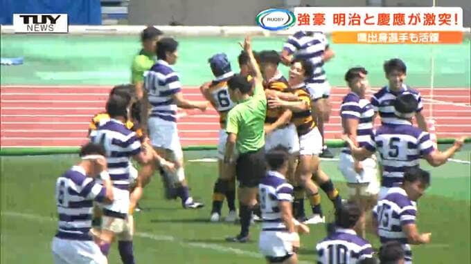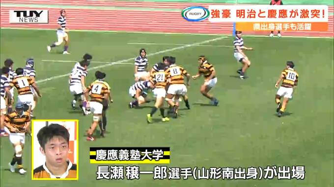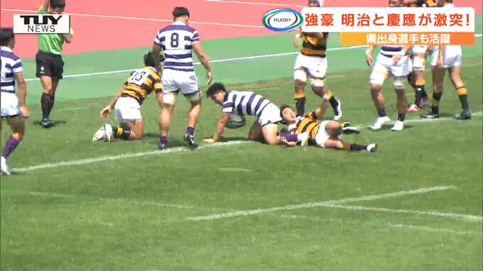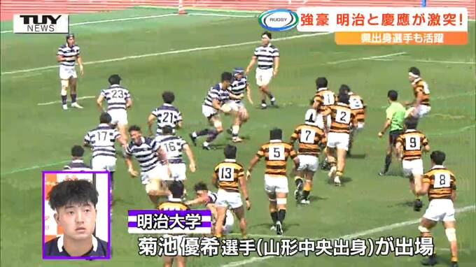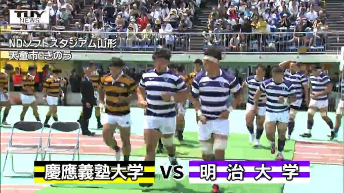 天童市できのう、大学ラグビーの強豪明治大学と慶應義塾大学の招待試合が行われました。県出身選手も出場し力強くプレーしました。
