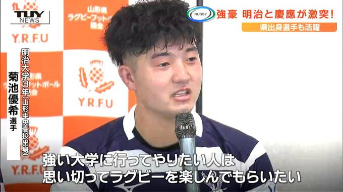 明治大学3年 菊池優希選手(山形中央高校出身)「きょうは地元という事で精一杯プレーしたんですけど結構タフな試合で、チーム、個人としても課題が残る試合でそこをしっかり修正していきたい。今山形のラグビーの人口が少ない中で強い大学に行ってやりたい人は思い切ってラグビーを楽しんでもらいたい」
