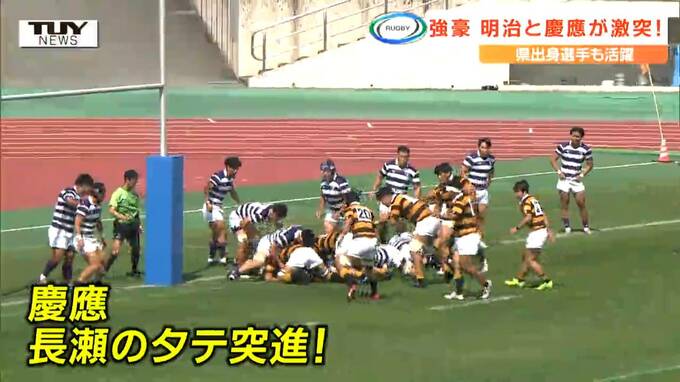 負けじと慶應の長瀬選手はボールに絡みトライを狙いますが明治の固い守りを崩せません。