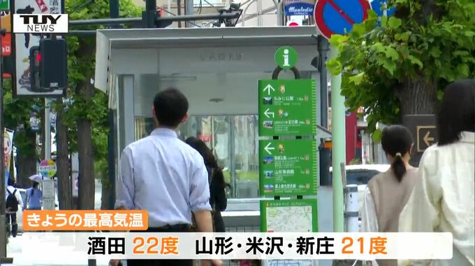 山形地方気象台によりますと、きょうの各地の最高気温は酒田が22度、山形・米沢・新庄が21度と平年よりも4度ほど低く肌寒い一日になる見込みです。