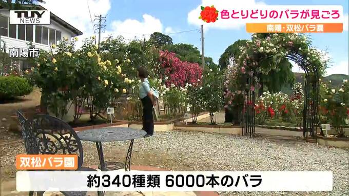 南陽市の双松バラ園です。高台にある園内には、およそ340種類6000本ほどのバラがあり、訪れた人を魅了しています。