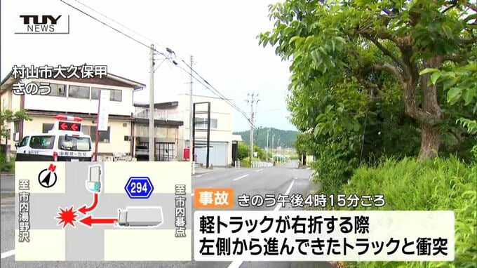 この事故はきのう午後4時15分ごろ、村山市大久保甲の県道294号で、軽トラックが十字路交差点を右折した際、左側から進んできたトラックと出会い頭に衝突したものです。