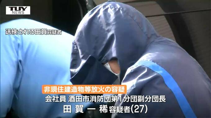 非現住建造物等放火の容疑で逮捕されたのは酒田市の会社員で酒田市消防団第1分団副分団長の田賀一稀容疑者(27)です。