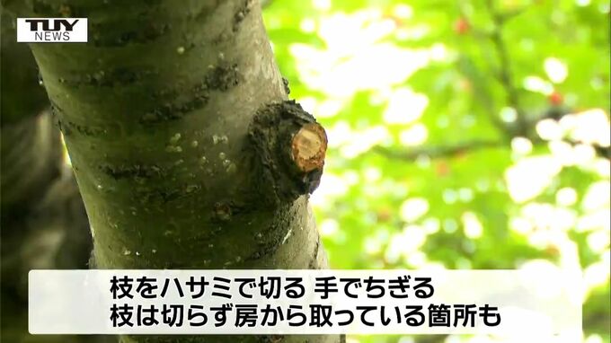 園地の人によりますと、枝をハサミで切る、手でちぎる、ほかにも枝は切らず房から取っている箇所もあったということです。