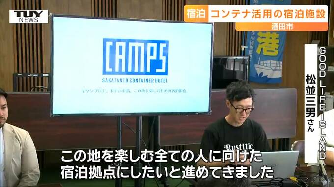 酒田港の商業施設「サカタント」を運営するGOOD LIFE ISLANDが記者会見で発表したのは、コンテナを利用した新しい宿泊施設「キャンプス」です。