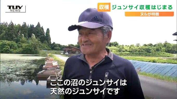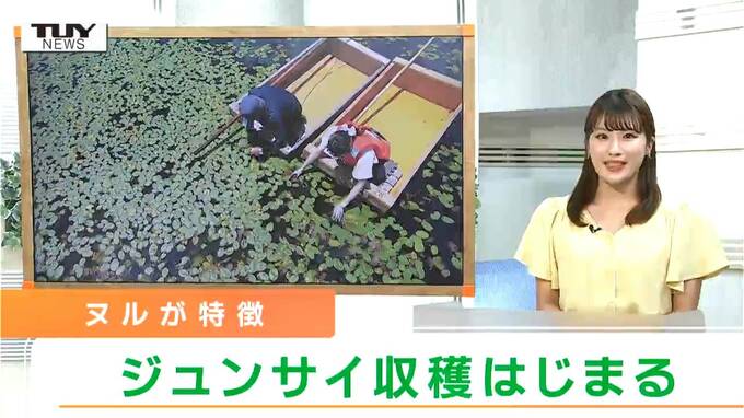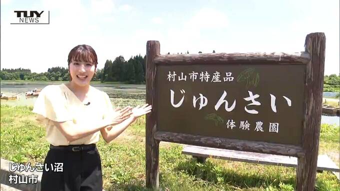 こんばんは。村山市では、いま初夏の味覚として人気のジュンサイの収穫が行われています。多くの人が訪れ収穫するジュンサイの魅力を取材しました。