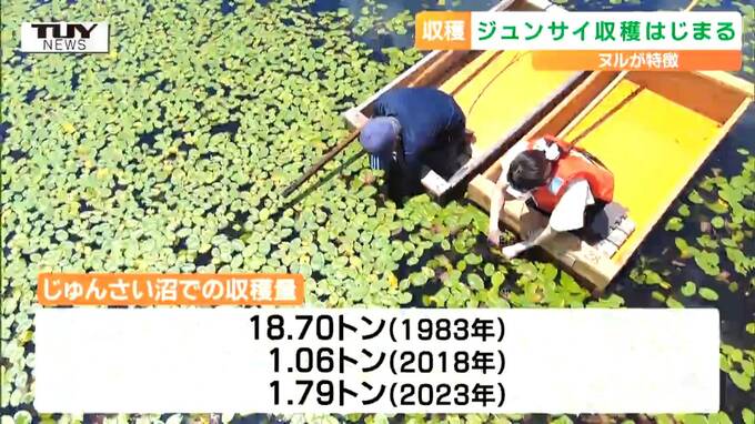 じゅんさい沼の広さはおよそ10ヘクタール。高齢化などで収穫する人が減り、現在の収穫量はピーク時の10分の1ほどになりました。それでも、6年前から一般の人が参加できる収穫体験をはじめ年々収穫量が増えてきているということです。
