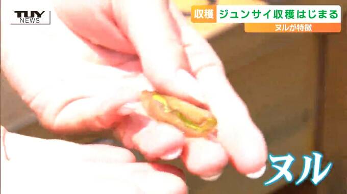 このプルプルした透明の部分がジュンサイ沼のジュンサイのおいしさの秘密、寒天質の「ヌル」です。