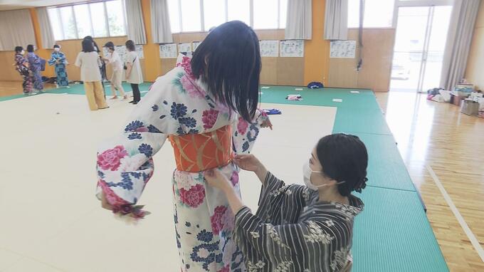 そこで学校が、中山町で学校と地域を結ぶ活動を行う団体に相談したところ、普段から着物や浴衣に触れている人たちが協力してくれることになり、今回の着付け体験が実現しました。