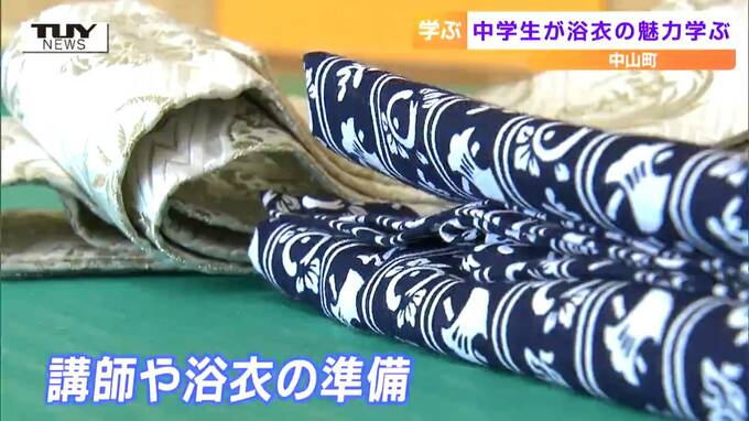 中山町立中山中学校で行われた浴衣の着付け体験は技術・家庭科の授業の一環として初めて開かれました。