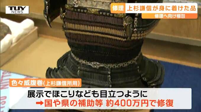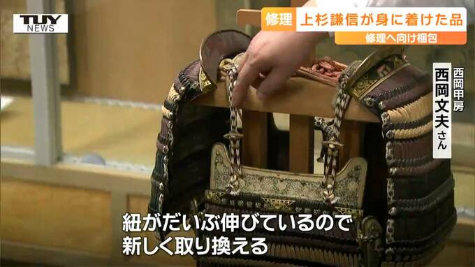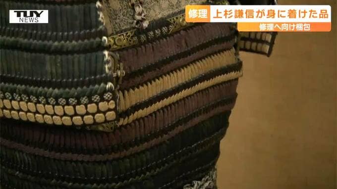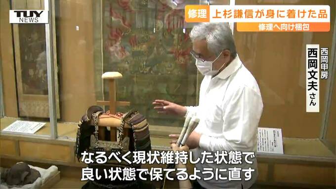 矢野秀樹アナウンサー「ちょうど作業が行われているのが上杉謙信公がおよそ500年前に着用していたというもの。黄色部分、紅花で染めている。500年経っても色あせていない」