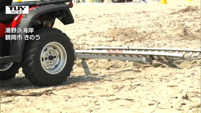 来月のオープンを前に、山形県鶴岡市の海水浴場で特殊な機材を使って海岸の清掃が行われました。