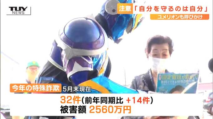 年金支給日はいわゆる「オレオレ詐欺」などの不審電話が多くなると言われています。このため、きらやか銀行新庄支店ではきょう、ご当地ヒーロー「未来創造戦士ユメリオン」などが詐欺被害防止を呼びかけました。