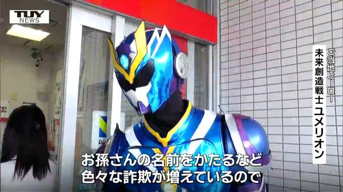 ご当地ヒーロー 未来創造戦士ユメリオン「お孫さんの名前を語ってとか色んな詐欺が増えているので、改めて今日は注意喚起でこのように渡してたので、気をつけて」