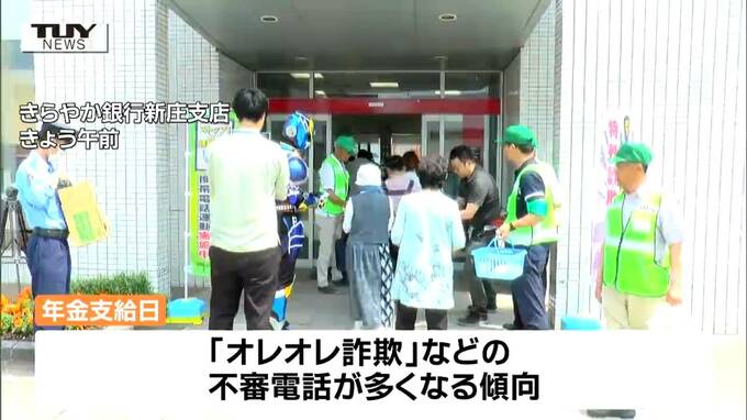 年金支給日のきょうに合わせ、山形県新庄市の銀行では、特殊詐欺への注意が呼びかけられました。