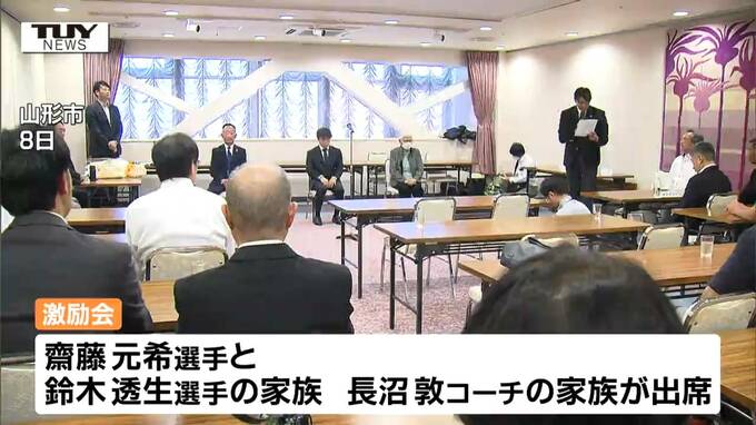 この日はパリオリンピック、パラリンピックに出場する県内水泳関係者の激励会が開かれ、齋藤元希選手のほか、パリオリンピックの水球に出場する山形市出身の鈴木透生選手と長沼敦コーチの家族が出席しました。