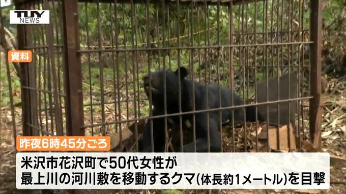 警察によりますと、昨夜6時45分ごろ、米沢市花沢町で、50代の女性が最上川の河川敷を移動する体長1メートルほどのクマ1頭を目撃したということです。