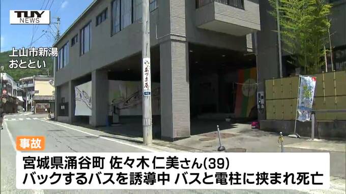この事故は、おとといの朝、上山市新湯で、宮城県涌谷町に住む佐々木仁美さんがバックするバスを誘導中に、電柱との間に挟まれ死亡したものです。