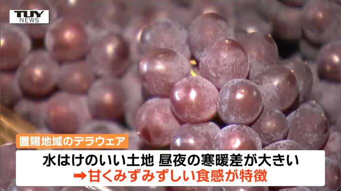 置賜地域のデラウェアは、水はけのいい土地で育てられ、昼夜の寒暖差が大きいことから、甘く瑞々しい食感が特徴で、全国的にも人気があります。