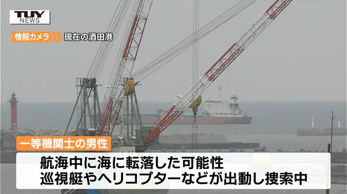 酒田海上保安部は、男性が航海中に海に転落した可能性があるとしていて巡視艇やヘリコプター、飛行機などが出動し、船が通ってきた酒田沖や秋田沖を捜索しているということですが、午前11時半現在、発見には至っていないということです。