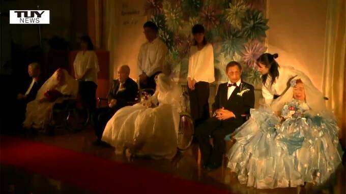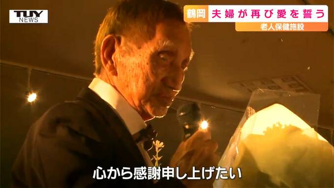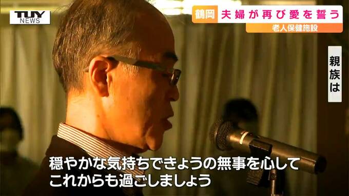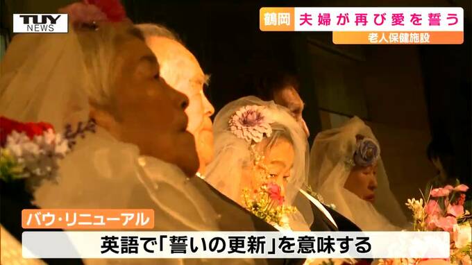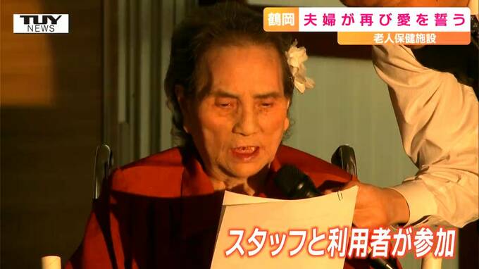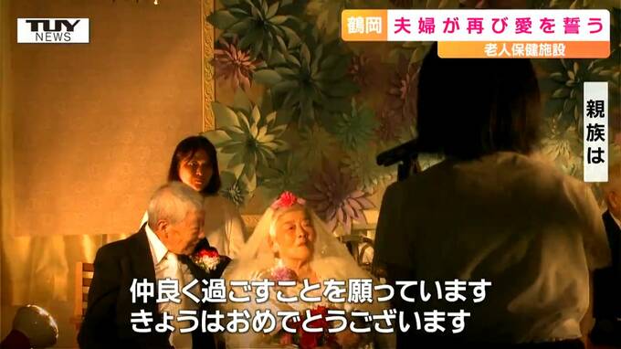 きょう、山形県鶴岡市の老人保健施設で、結婚を祝う披露宴がとり行われました。新たに誓いをたてたのは全員結婚から60年をこえた夫婦です。