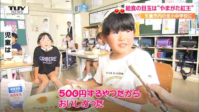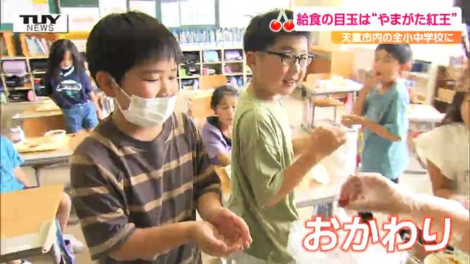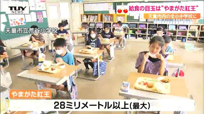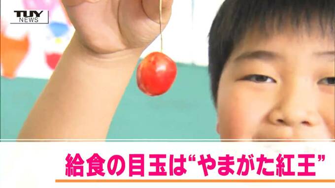 天童市立荒谷小学校の給食に、今週出荷が始まった「やまがた紅王」が登場しました。