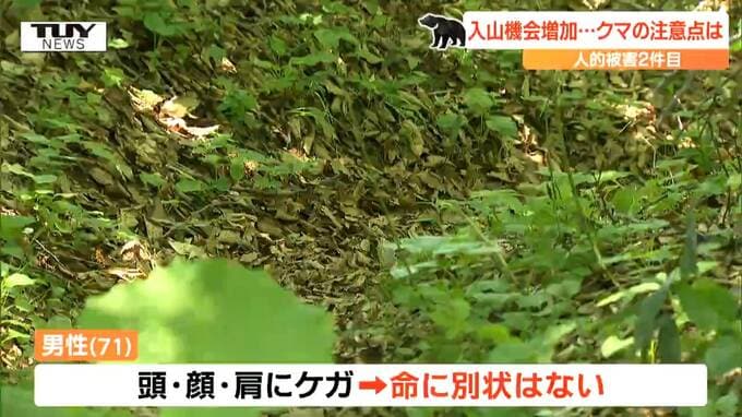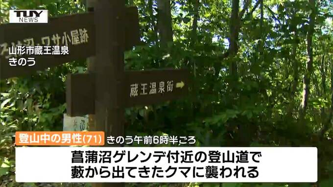 警察や山形市などによりますと、きのう午前6時半ごろ、山形市蔵王温泉スキー場菖蒲沼ゲレンデ付近の登山道で、登山中の71歳の男性が藪から出てきたクマに襲われました。男性は、頭と顔、肩にケガをしましたが、命に別状はないということです。