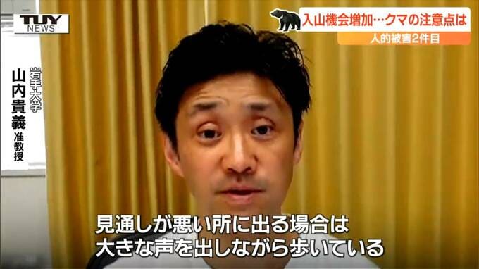 クマの生態に詳しい岩手大学の山内准教授です。クマは、早朝や夕暮れなど薄暗い時間帯に活動が活発になるといいます。山に入る際、存在を知らせるため、音が出るものを身に着けることが大切だとしています。