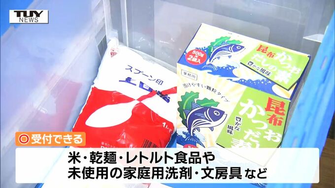 フードドライブでは、賞味期限が1か月以上残っていて、常温で保存ができる、米や乾麺、レトルト食品などのほか、未使用の家庭用洗剤や、シャンプー、文房具も受け付けています。