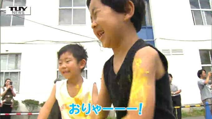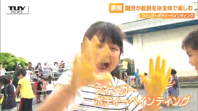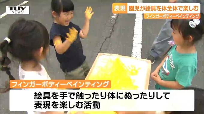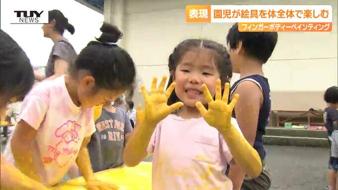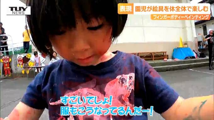 天童市のたかだま幼稚園できょう行われたのは、「フィンガーボディーペインティング」です。文字どおり絵具を手で触ったり、体にぬったりして、表現を楽しむダイナミックな活動です。