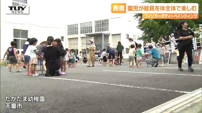 山形県天童市の幼稚園で、きょう、絵具を体全体で楽しむフィンガーボディーペインティングが行われ、園児がのびのびと表現を楽しみました。