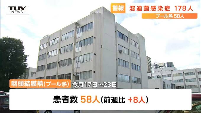 また、咽頭結膜熱、いわゆるプール熱の患者数は58人で前の週より8人増加しました。