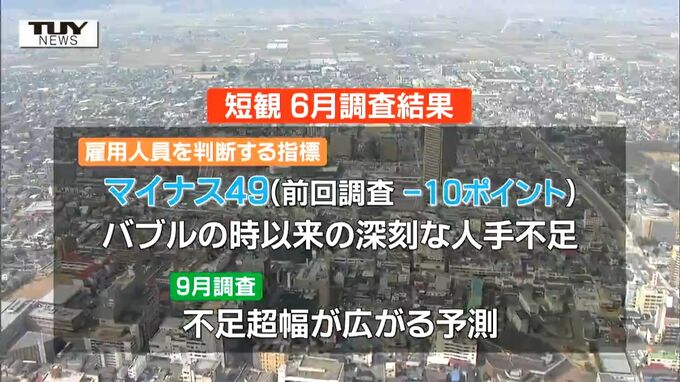 一方、企業はバブルの時以来の深刻な人手不足の状況で、雇用人員を判断する指標はマイナス49と、不足超幅は10ポイント拡大しています。
