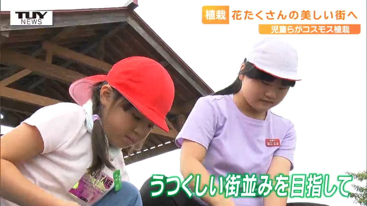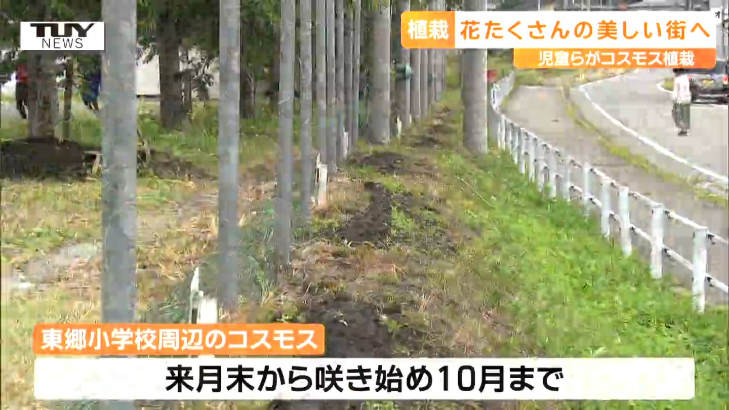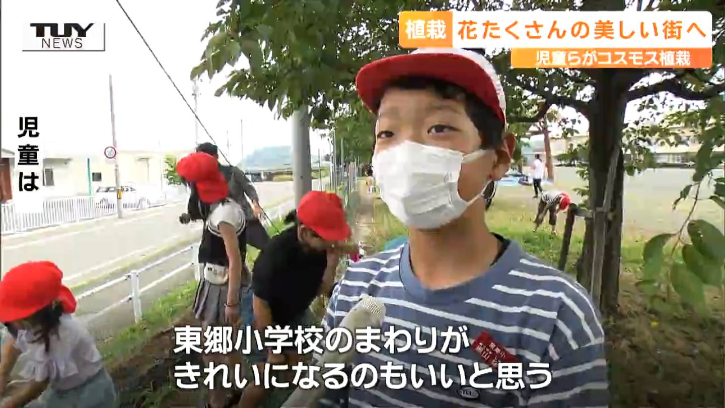 花であふれる地域づくりをしていこうと東根市東郷地区ではきょう、子どもたちが、コスモスの種をまきました。