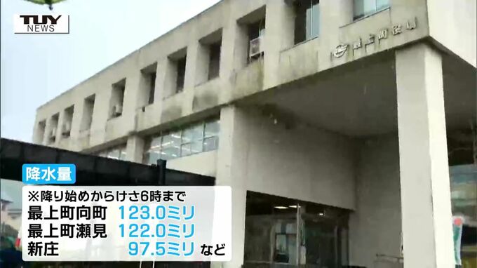 降り始めからけさ6時までの降水量は、最上町向町で123ミリ、最上町瀬見で122ミリ、新庄で97.5ミリなどとなっています。