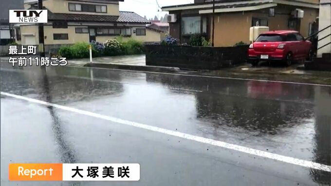 大塚美咲アナウンサー「午前11時の最上町です。雨が激しく降っていて、道路には所々水たまりができています」