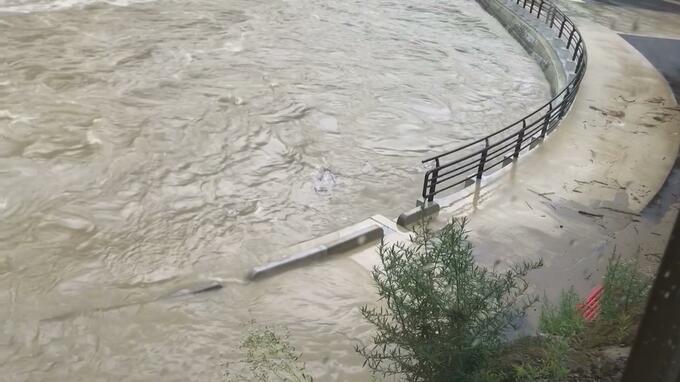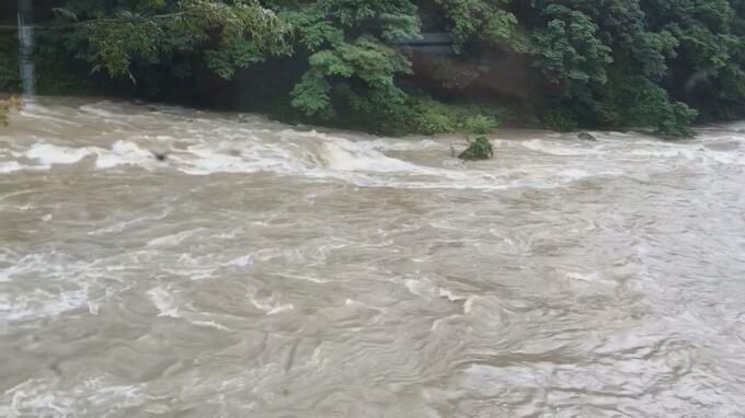 こちらは、午後1時半ごろ、最上町で撮影された最上小国川の映像です。濁った川の水が勢いよく流れています。