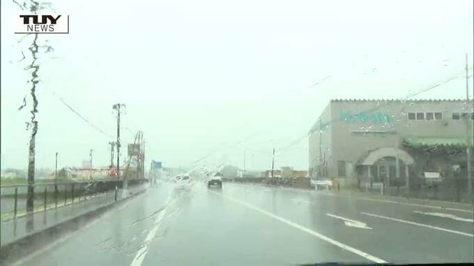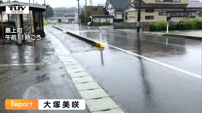 大塚美咲アナウンサー「午前11時の最上町です。雨が激しく降っていて、道路には所々水たまりができています」