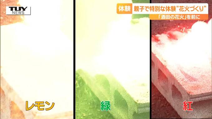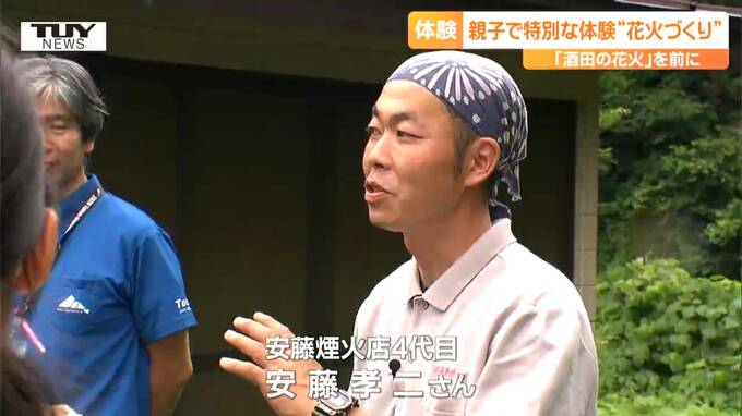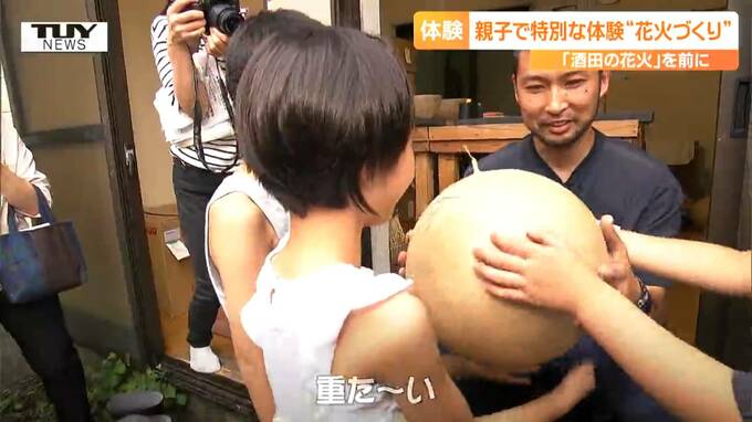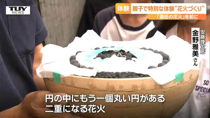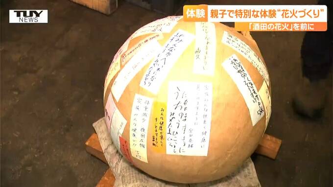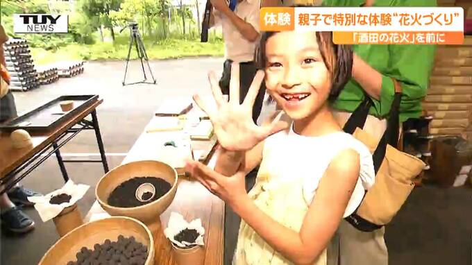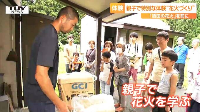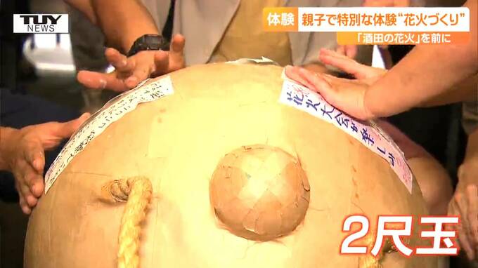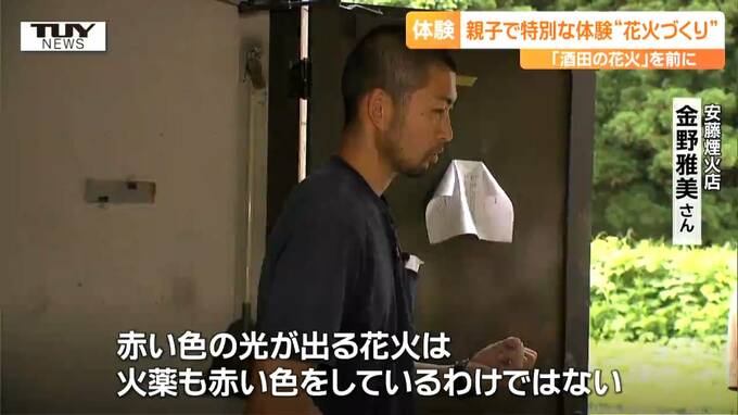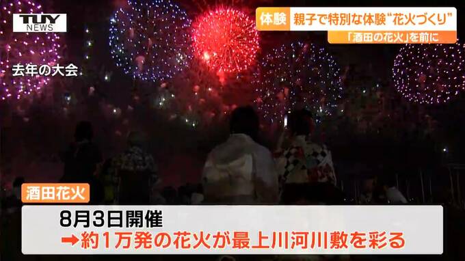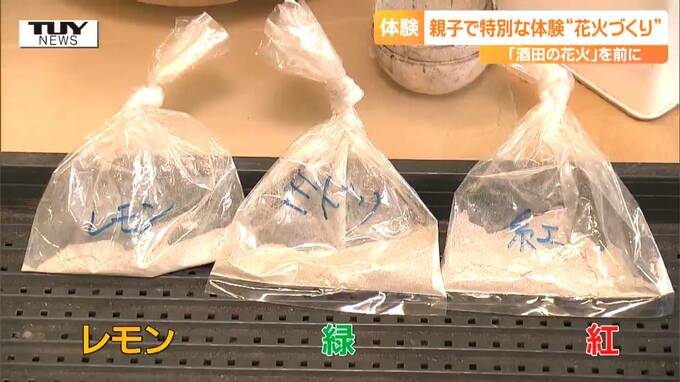 来月、酒田市で行われる夏の風物詩「酒田の花火」の準備が進む中、きのう、親子で、花火づくりを体験するイベントが開かれました。