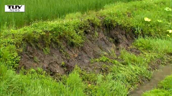 大塚美咲アナウンサー「午前10時半の最上町です。今も大粒の雨が降っています。こちらの田んぼではきのうからの雨の影響でしょうか。土手が崩れてしまっています。」