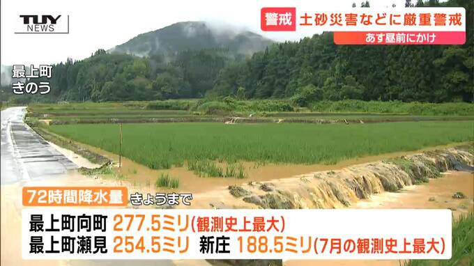 きょうまでの72時間に降った雨の量は、最上町向町で277.5ミリと観測史上最大、最上町瀬見で254.5ミリ、新庄で188.5ミリと7月の観測史上最大を記録しました。