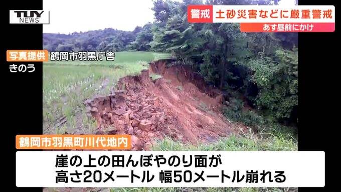 また、鶴岡市羽黒町川代地内では、崖の上の田んぼやのり面が高さ20メートル、幅50メートルに渡って崩れています。