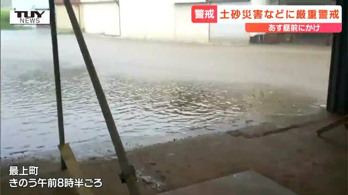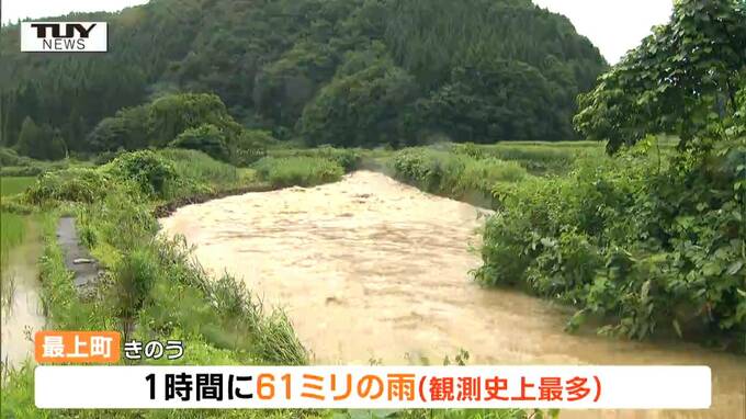 きのう1時間に61ミリと観測史上最も多い雨が降った最上町では、きょうも断続的に雨が降り続き、路面には雨が強く打ち付けていました。