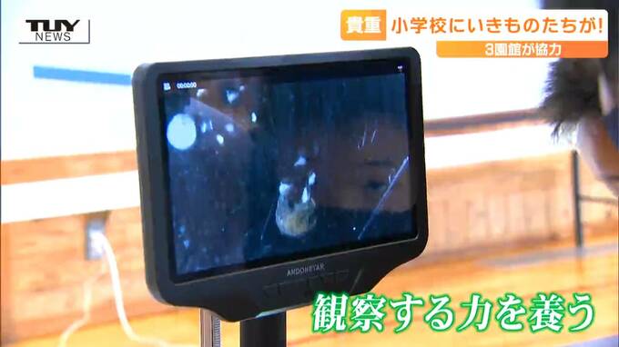 鶴岡市では生き物と直接触れ合える動物園と水族館が小学校の体育館にやってきました。児童たちにとって貴重な機会になったようです。
