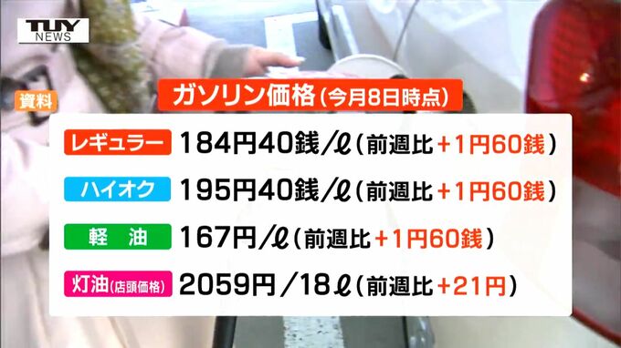 資源エネルギー庁によりますと、今月8日時点の県内レギュラーガソリンの平均小売価格は、前の週より1円60銭上がり、1リットルあたり184円40銭でした。