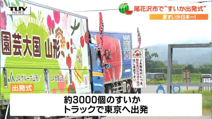 式では、生産者の思いが詰まったおよそ3000個のすいかがトラックに積み込まれ、早速東京へ出発しました。