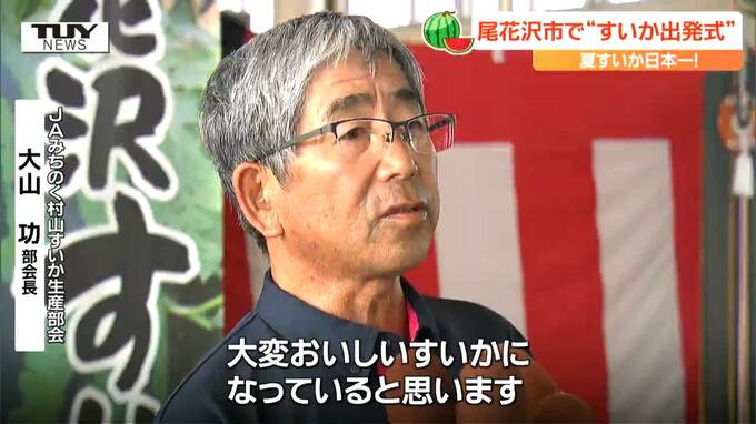 JAみちのく村山すいか生産部会 大山功 部会長「今年は春から水分不足で定植もままならなかったが、例年通りの甘みとシャリとやっぱり尾花沢すいかはシャリが命ですので大変おいしいすいかになっていると思います」