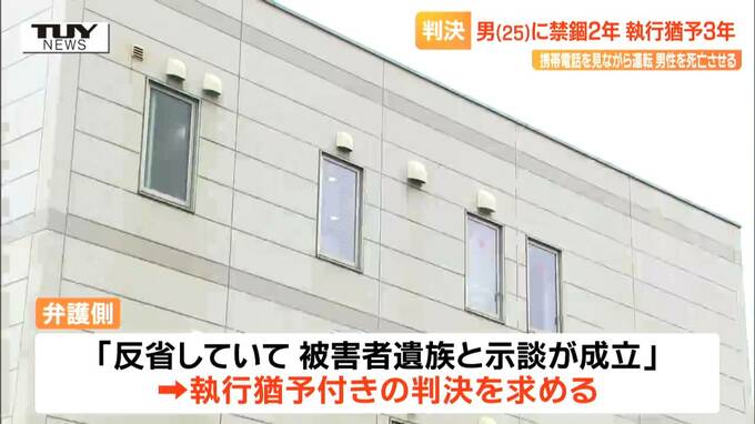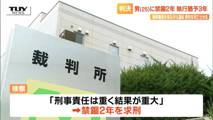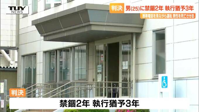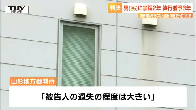 手に持った携帯電話の画面を見ながら車を運転して男性をはね、死亡させた罪に問われている村山市の25歳の男の裁判がきょう開かれ、裁判所は男に禁錮2年、執行猶予3年の有罪判決を言い渡しました。